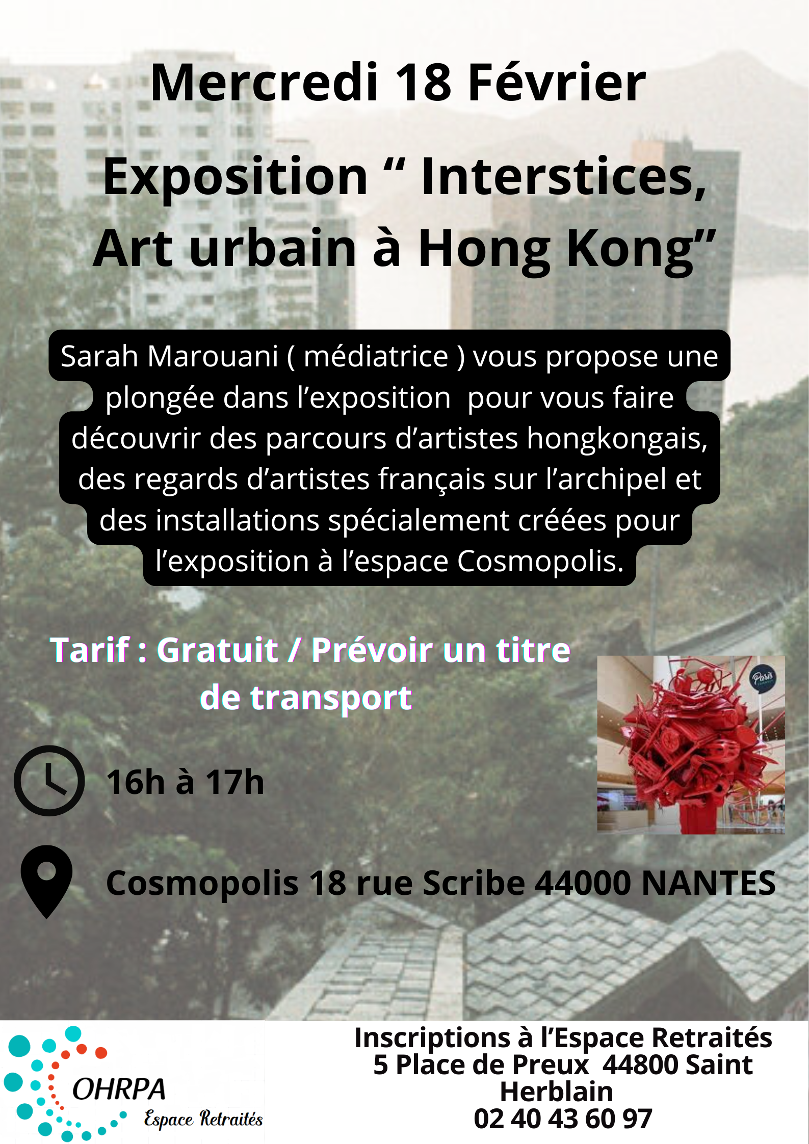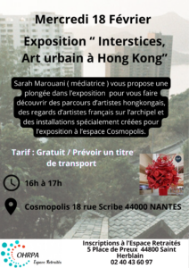 Sarah Marouani (médiatrice) vous propose une plongée dans l’exposition pour vous faire découvrir des parcours d’artistes hongkongais, des regards d’artistes français sur l’archipel et des installations spécialement créées pour l’exposition à l’espace Cosmopolis à Nantes.