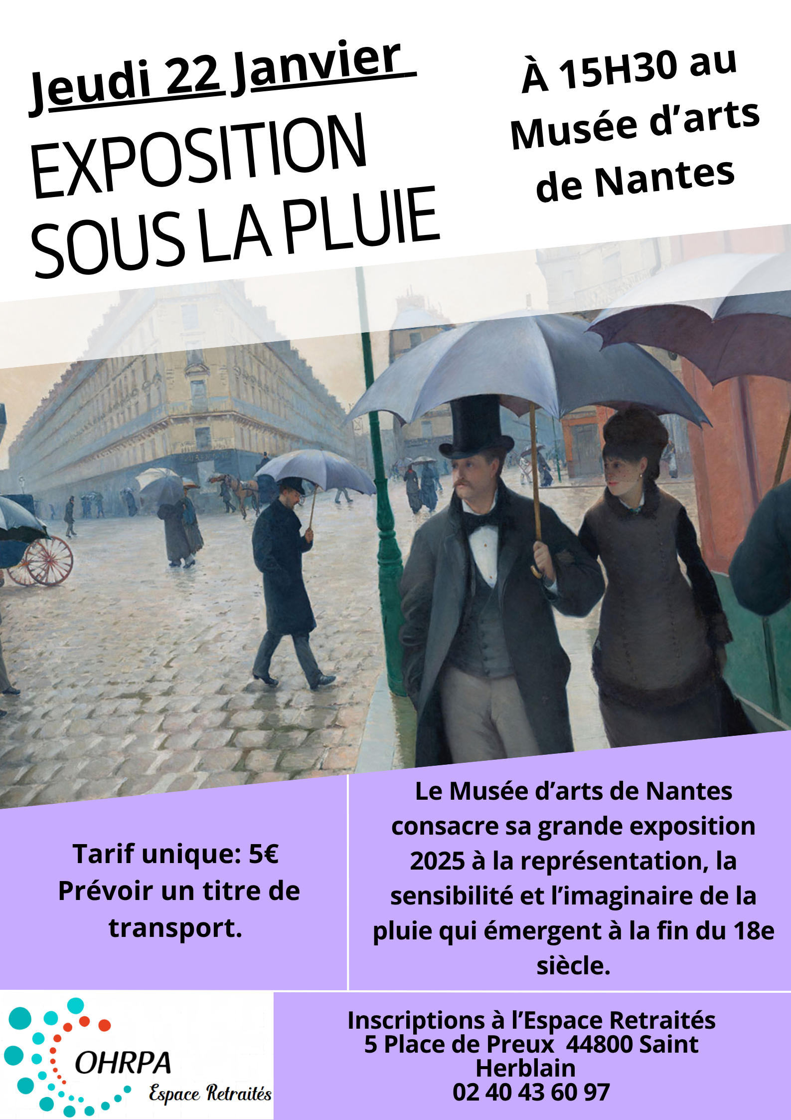 Visite guidée et commentée. Le Musée d’arts de Nantes consacre sa grande exposition 2025 à la représentation, la sensibilité et l’imaginaire de la pluie qui émergent à la fin du 18e siècle. Sujet littéraire, objet d’études scientifiques, apprivoisée par les citadins dans des villes modernisées, la pluie devient un motif pour les peintres, les photographes, les cinéastes jusqu’aux artistes contemporains.