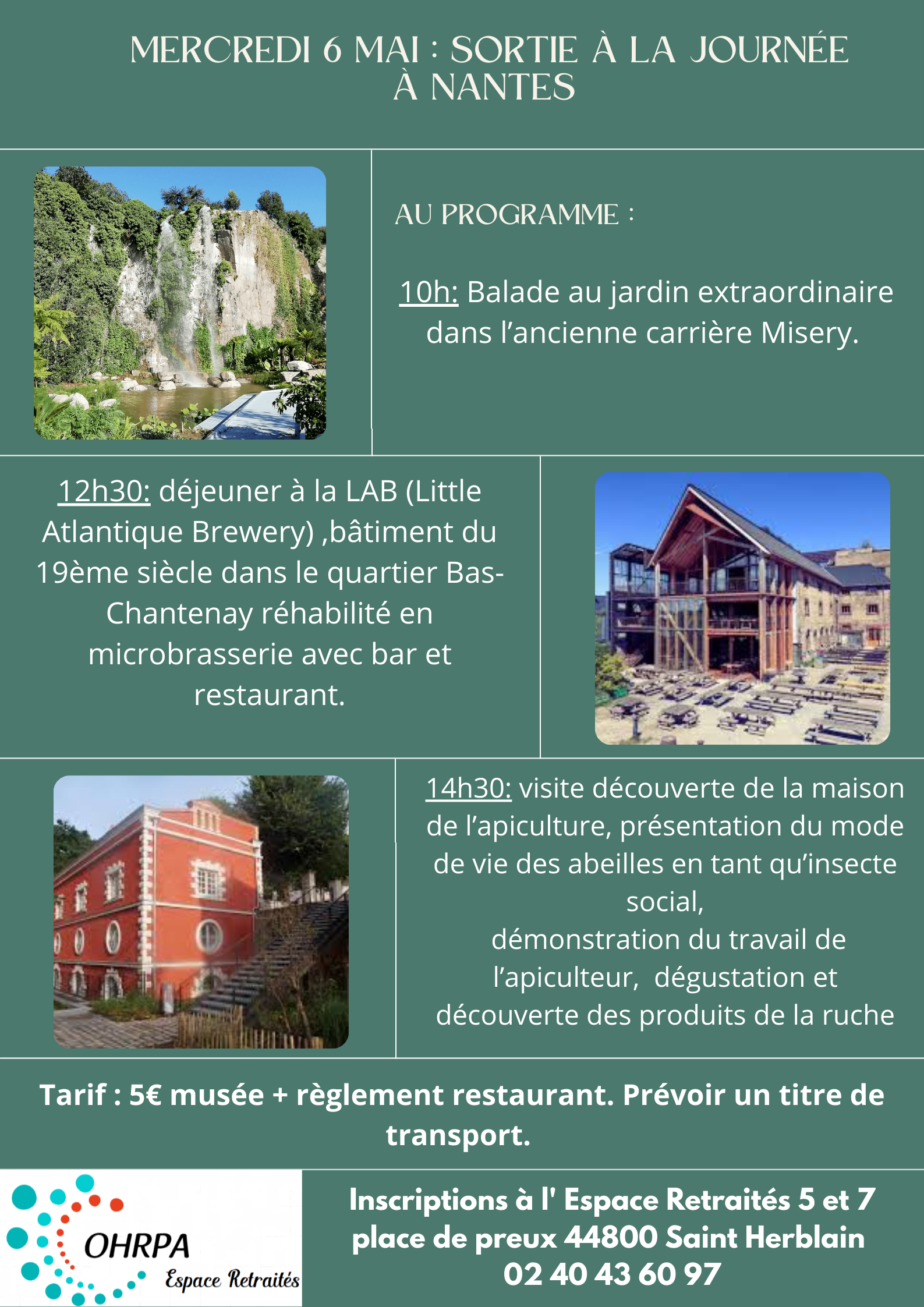 Au programme : 10h: Balade au jardin extraordinaire dans l’ancienne carrière Misery / 12h30: Déjeuner à la LAB ( Little Atlantique Brewery), bâtiment du 19ème siècle dans le quartier Bas-Chantenay. 14h30: Visite découverte de la maison de l’apiculture, présentation du mode de vie des abeilles, démonstration du travail de l’apiculteur, dégustation et découverte des produits de la ruche.