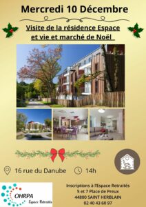 En après-midi : Les résidences services accueillent des personnes âgées autonomes ou relativement autonomes dans des logements priatifs associés à des services collectifs. La résidence Espace et vie vous invitent à plonger dans l’atmosphère des fêtes de fin d’année avec son marché de Noël. L’occasion parfaite pour découvrir des créations artisanales, des produits locaux et des gourmandises ainsi, de découvrir la résidence avec une visite accompagnée.
